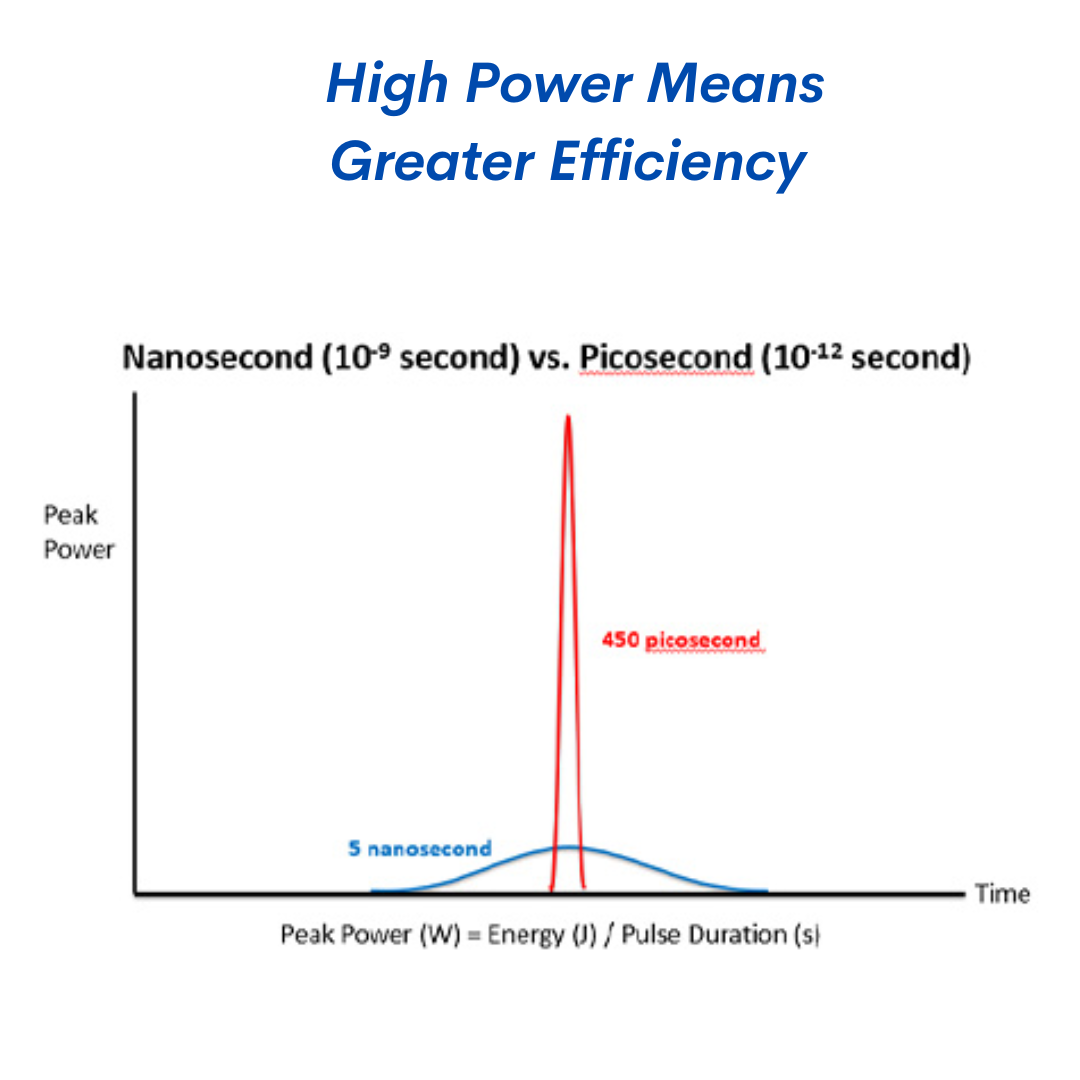 Picosecond lasers can destroy pigment up to 100 times faster than traditional nanosecond laser technology.   As the laser light is passed over the tattooed skin, the picolaser targets the tattoo ink exclusively with extreme precision,  microscopically shattering the ink pigment into tiny particles, which are then easily processed and eliminated by the body.