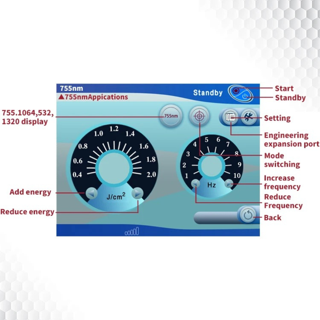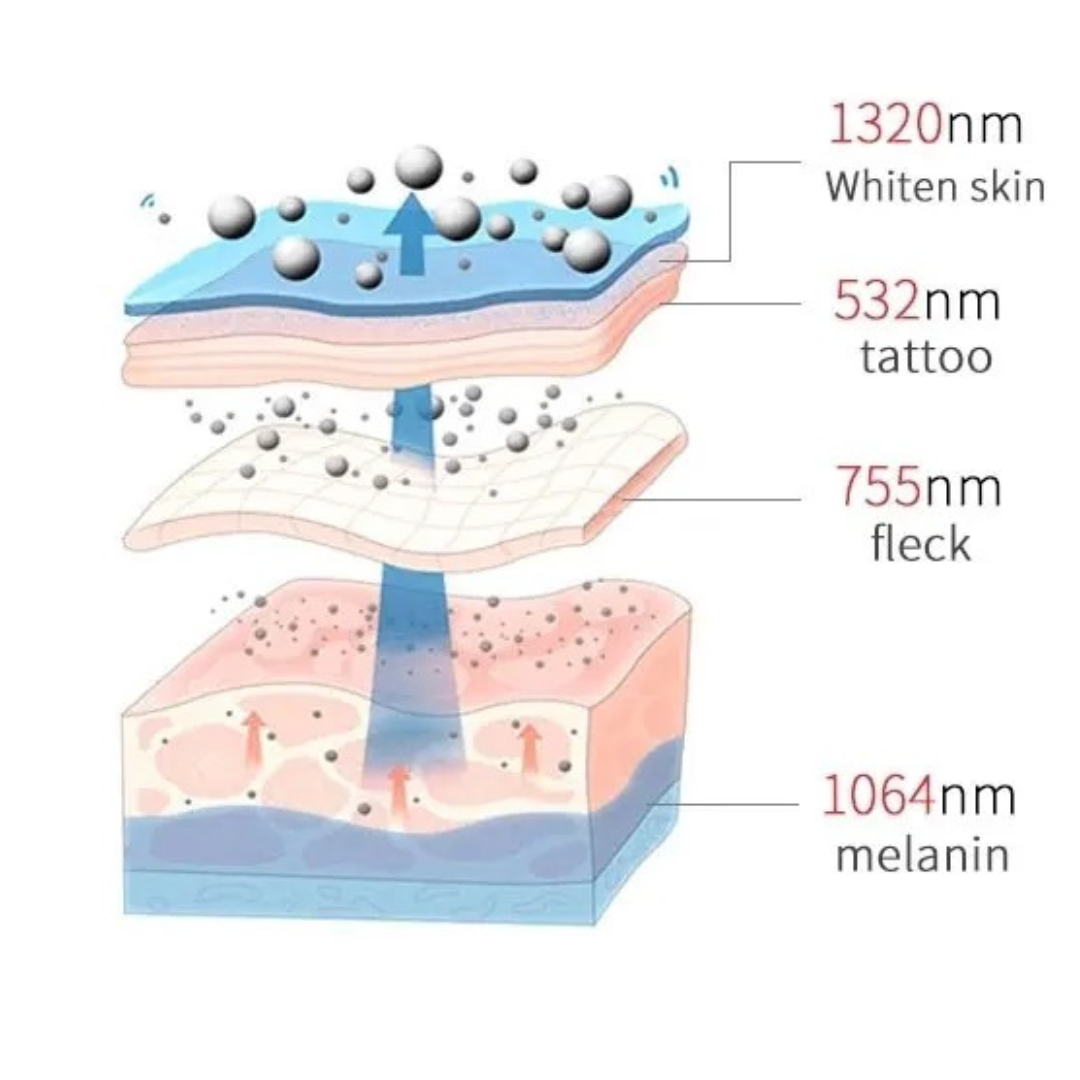 - 4 Wavelengths - 1064nm, 532nm, 755nm (pico) and 1320nm (carbon facial peeling)