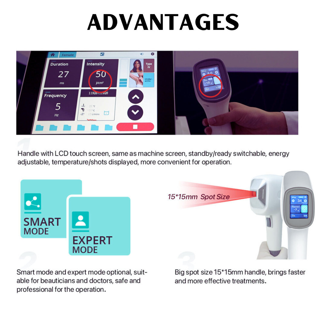 - The large spot size 15*15mm handle size allows for faster and more effective hair removal treatments.